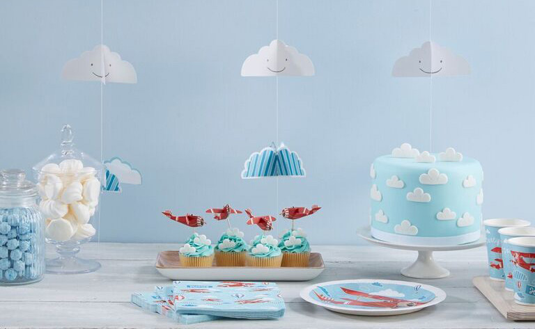FLYING HIGH FRÅN EXKLUSIVA GINGER RAY - charmigt tema med flygplan i vintagestil för lillprinsen! Underbara dekorationer som passar perfekt på de första födelsedagskalasen.