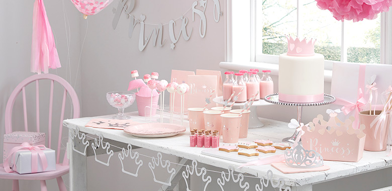 PRINCESS PERFECTION FRÅN EXKLUSIVA GINGER RAY - sockersöta dekorationer i pastellrosa och print i silverfolie för lillsessans kalas!