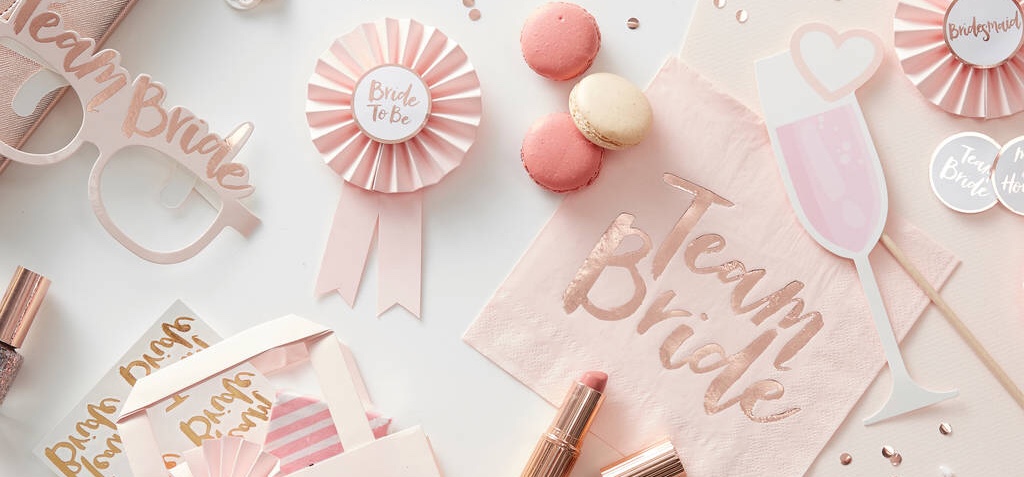 TEAM BRIDE - FRÅN GINGER RAY! Dessa exklusiva dekorationer kommer garanterat ge er den perfekta touchen på er möhippa! Ge er väninna en dag hon sent kommer glömma och skäm bort henne och er med tillbehör i bedårande toner av roséguld och pastellrosa.