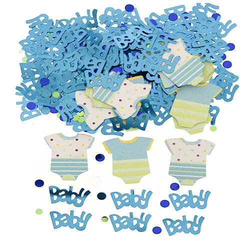 Sockersöt konfetti i blått som definitivt kommer addera en extra touch till din Baby Shower! Konfettin kommer i en blandning av små baby-kläder, glittrande prickar och texten "Baby".