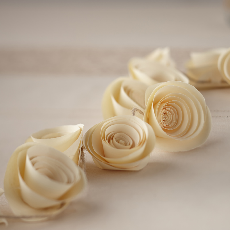 Denna vackra och iögonfallande girlang med handgjorda pappersrosor i ivory är perfekt för alla bröllop. Girlangen kan med fördel hängas mot en vägg, på baksidan av brudparets stolar eller användas som bordsdekorationer.