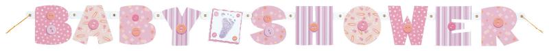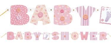 Supersöt vimpel i ljusrosa med bokstäver som bildar texten "Baby Shower".