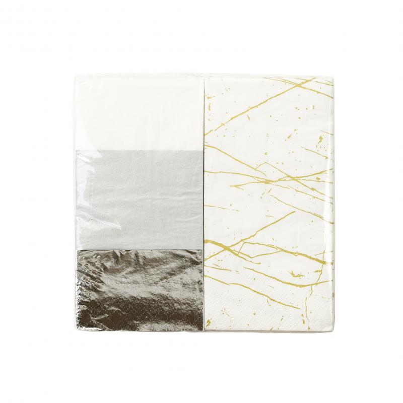 These trendy narrow napkins come in 2 designs – white abstract flecked marble effect with gold foil and silver,grey and white colour block design.
