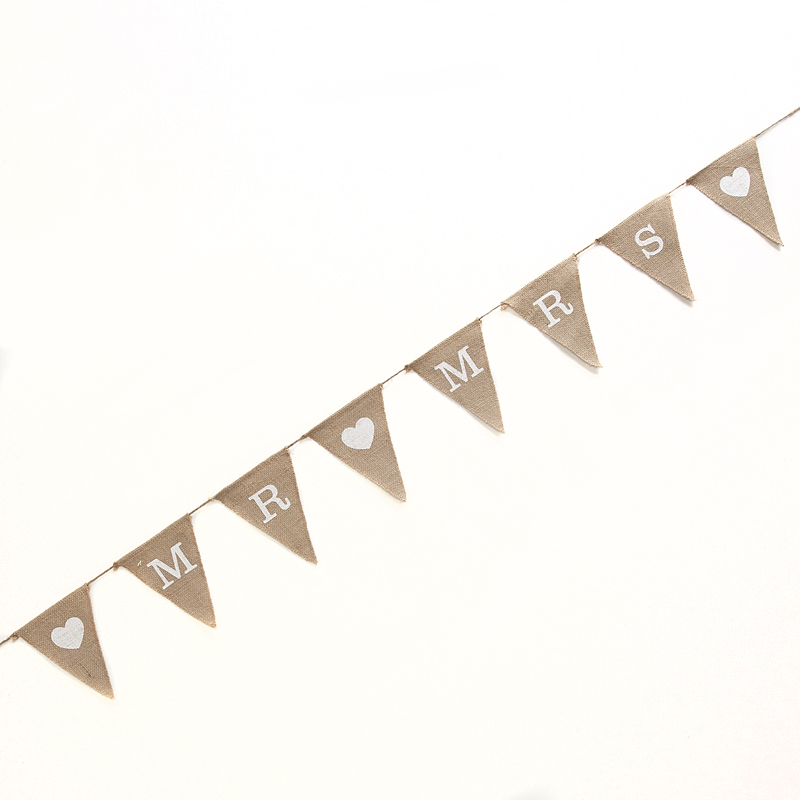 Denna rustika och iögonfallande vimpel med texten "Mr & Mrs" är perfekt för alla bröllop. Funkar utmärkt på mottagningen vare sig den är inom- eller utomhus! Vimpeln kan med fördel hängas mot en vägg eller ovanför honnörsbordet. Varje bokstav är tryckt i vitt på varsin trekantig flagga i juteväv med vita hjärtan före och efter texten, och i vardera ände avslutas vimpeln med virkade spetsband. Anordningen hängs enkelt upp med hjälp av natursnöre på vardera sida.