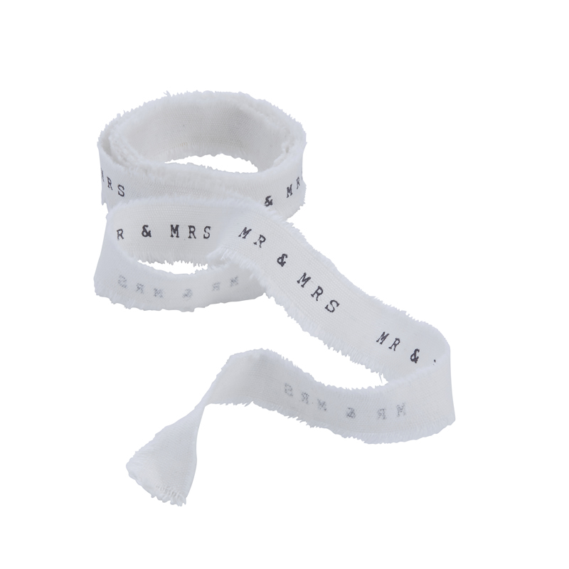 Detta romantiska, vita band med sliten kant och texten "Mr & Mrs" som är tryckt med ett gammalt typsnitt i skrivmaskinsstil, passar perfekt att slå in små gåvor med eller knyta runt påsar.