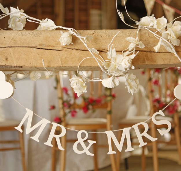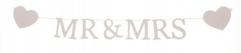 This is a great version of our Sass and Belle garlands, with Mr & Mrs with two hearts. It is made out of white painted wood, strung on simple string, with fixings at either end. A super wedding decoration and a fantastic price.