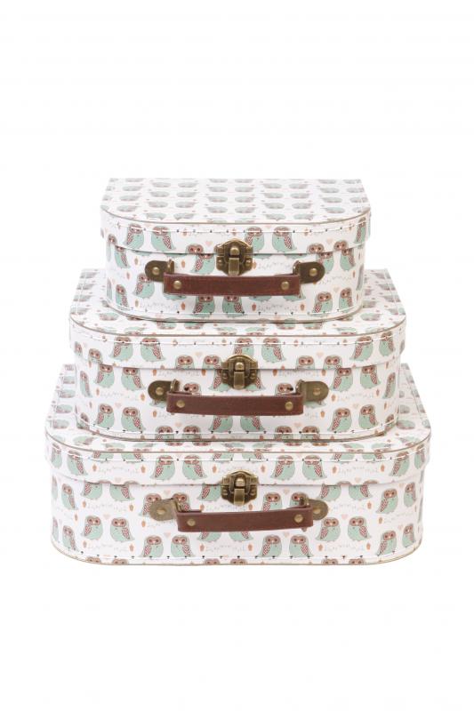 De vackra resväskorna är gjorda av förstärkt papper med metallspännen och gedigna handtag i brunt konstläder. Dessutom är de tryckta med ett gulligt uggelmotiv i brunt, vintagegrönt och vitt. Den förtjusande uppsättningen av tre väskor, som passar inuti varandra, gör detta till en härlig och pampig gåva, som vi garanterar kommer att mottagas med stor glädje. Detta är den optimala presenten till Baby Showern, dopet eller födelsedagen!