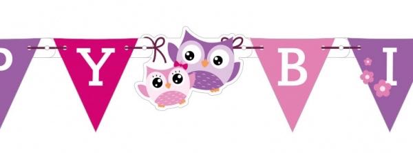 Supersöt vimpel med rosa och lila ugglor och texten "Happy Birthday". Perfekt för födelsedagskalaset!