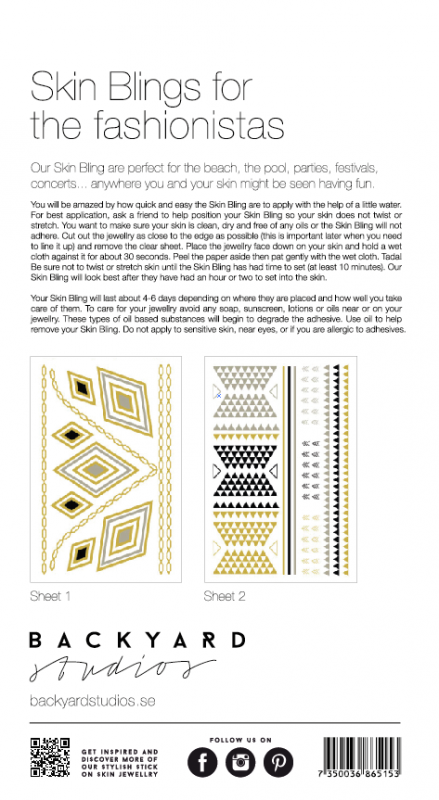Backyard Studios Skin Jewellery fästs enkelt på huden. De är giftfria, eco-vänliga, vattentåliga och varar i 3-6 dagar beroende på omständigheterna, skötsel och din hud.